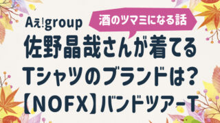アイドル 『酒のツマミになる話 』佐野晶哉(Aぇǃgroup)が着てるTシャツのブランドは?NOFXのツアーT Aぇǃgroupの佐野晶哉さんが『酒のツマミになる話』で着ていたNOFXの“Mons Tour”ヴィンテージTシャツについて、ブランド/購入方法/価格の目安を徹底調査。ファッション好き・バンドTシャツコレクター必見! 2025.09.14 アイドルエンタメ