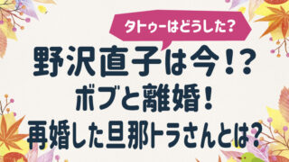 エンタメ 野沢直子は今!?ボブと離婚!再婚した旦那トラさんとは? 野沢直子、再婚相手トラさんとの現在の暮らし・ボブとの離婚経緯、タトゥー問題を含むトータルライフを徹底解説。 2025.09.23 エンタメ